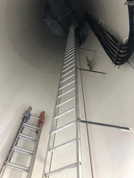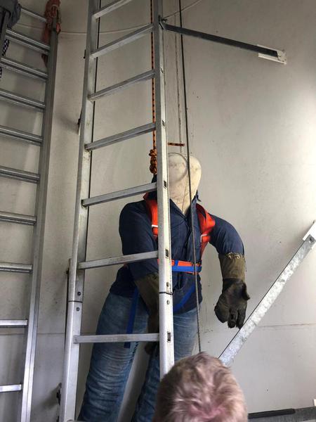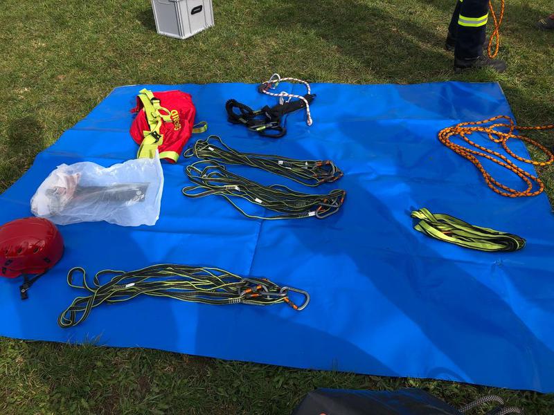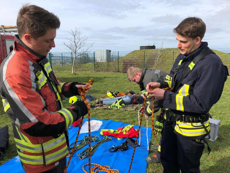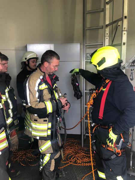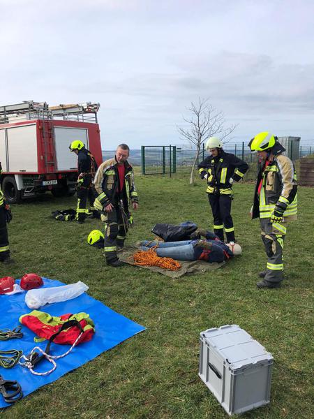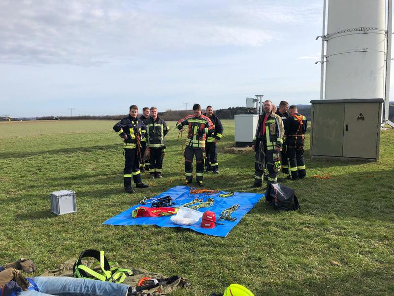Geübt wurde die Rettung einer abgestürzten Person in einem Windrad. Mit Hilfe eines Absturzsicherungsrucksackes wurde die Person gerettet, sowie die Handhabung mit diesem und die Knotenkunde aufgefrischt.